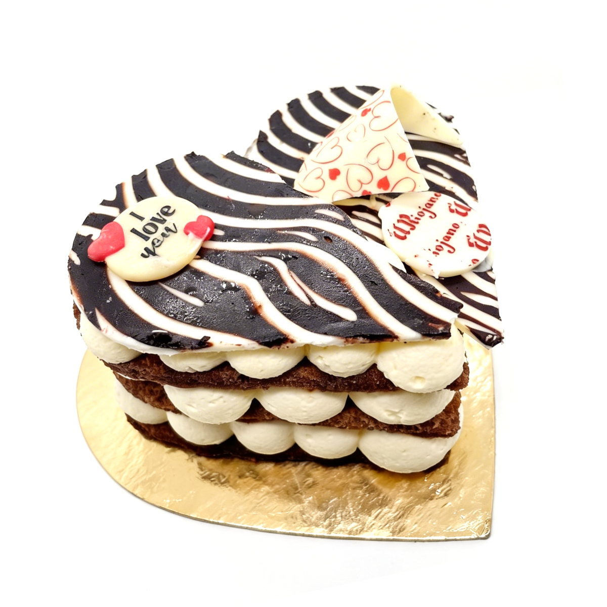Bizcocho de chocolate en forma de corazón, emborrachado con café y amaretto, relleno de nata y queso mascarpone, decorado con chocolate.
